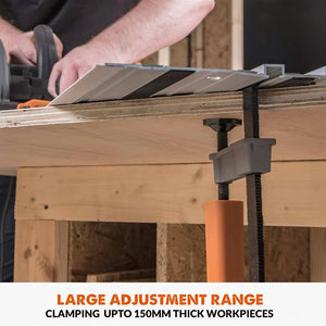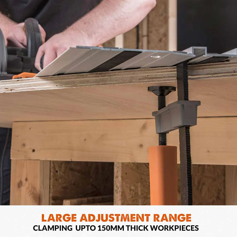 - Łatwo przymocuj szynę do przedmiotu obrabianego za pomocą specjalnie zaprojektowanych zacisków znajdujących się w zestawie.